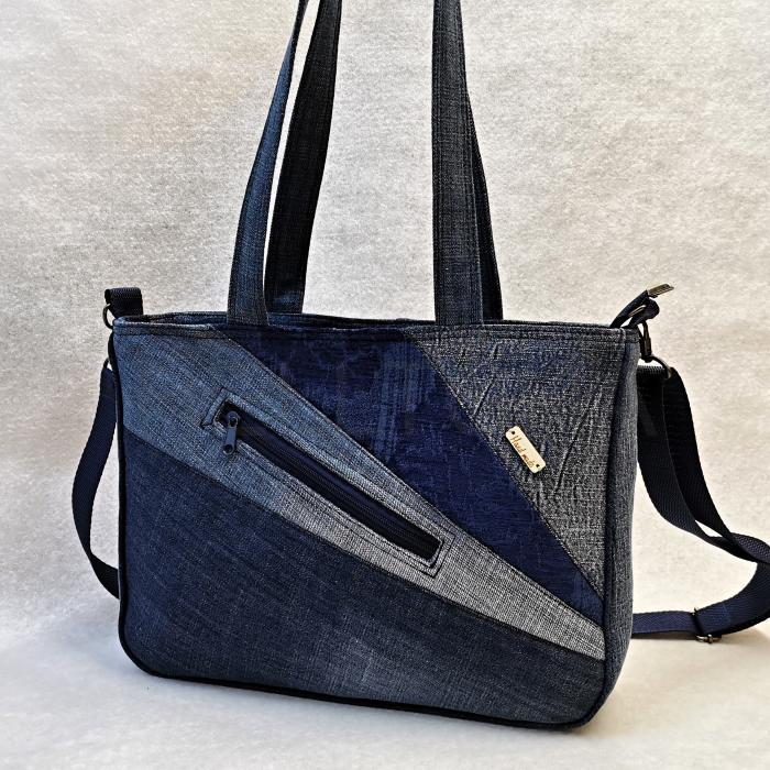 Ručně šitá riflová kabelka z džínoviny. Přední díl je paprskovitě sesazen z různých odstínů materiálu a doplněn zipovou kapsou. Zadní díl je sešitý z menších dílků rifloviny. Taška má dvě ucha o délce ca 70cm, takže ji lze nosit v ruce i přes rameno, a je opatřena nastavitelným popruhem o délce ca 130cm.