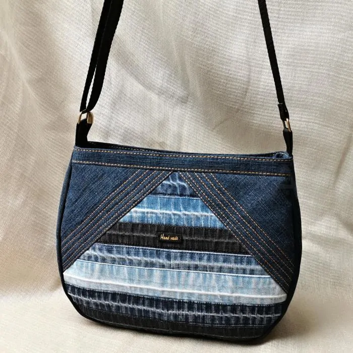 Ručně šitá jeansová jeansová kabelka z kvalitní rifloviny. Přední díl je ozdoben septanými lemy a kontrastně proštepován. Na zadním díle je jedna zipová kapsa. Kabelka má jedno ucho nastavitelné až do délky 140cm, tak lze nosit přes rameno nebo křížem jako crossbody.