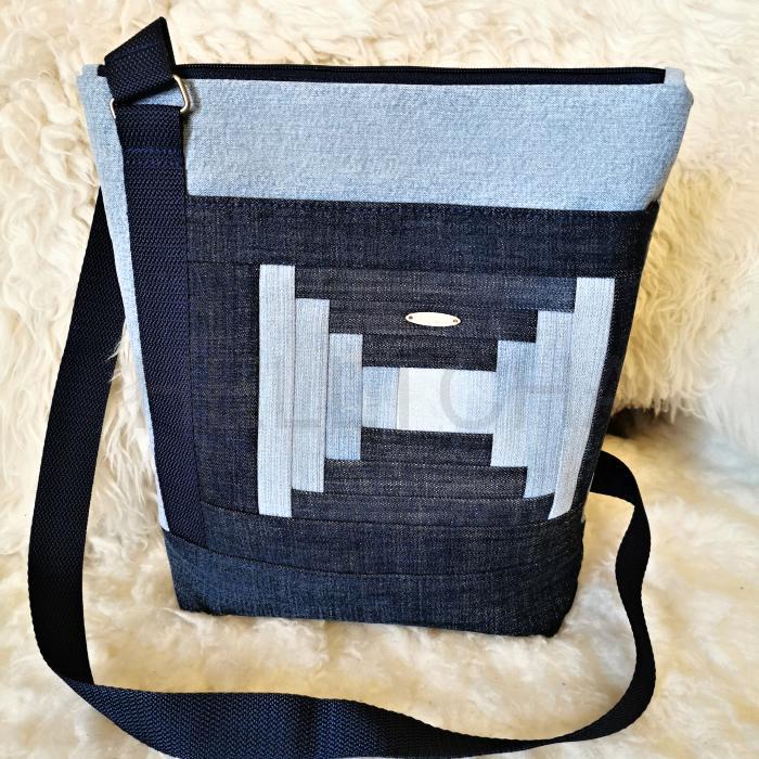 Ručně šitá crossbody kabelka z kvalitní rifloviny. Přední díl je ozdoben pravidelným patchworkem členěným do čtverce. Patchworková část zároven tvoří kapsu, která je zapínaná na magnet. Zadní díl je opatřený zipovou kapsou. Celá kabelka je podložena pevným ronofixem, aby dobře držela tvar.