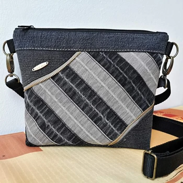 Ručně šitá crossbody kabelka z kvalitní černé rifloviny kombinovaná s béžovou. Přední díl je členěný a je ozdoben kovovými zipy.